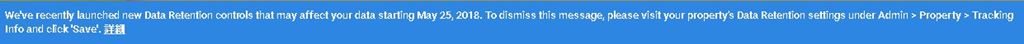We’ve recently launched new Data Retention controls that may affect your data starting May 25, 2018. To dismiss this message, please visit your property’s Data Retention settings under Admin > Property > Tracking Info and click ‘Save’.