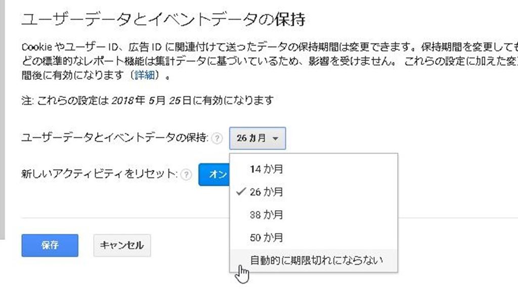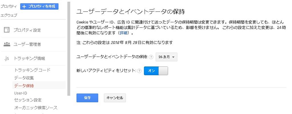 ユーザーデータとイベントデータの保持:26ヶ月