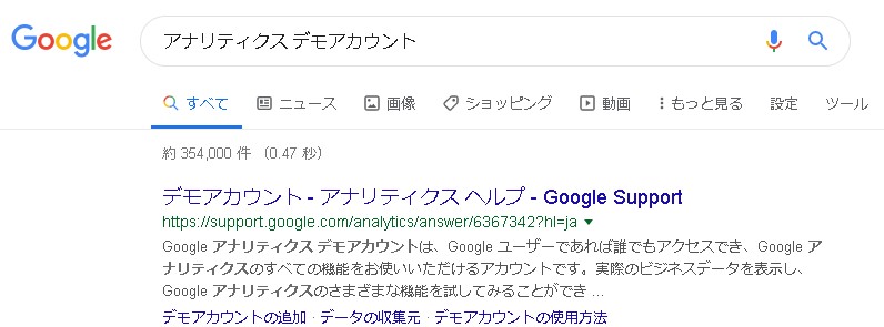 まずは「アナリティクス デモアカウント」といったキーワードで検索すると、デモアカウント – アナリティクス ヘルプ – Google Supportのサイトが1番目に表示されるはずです。