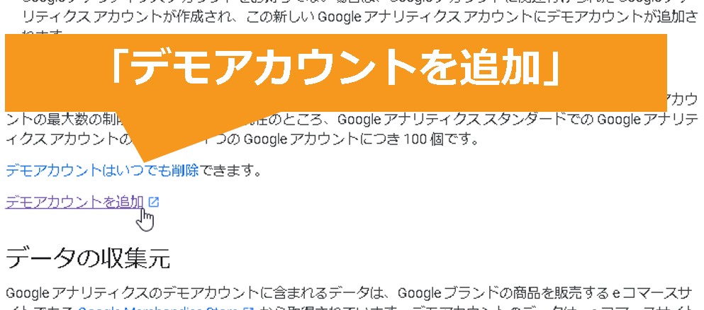 デモアカウント – アナリティクス ヘルプ – Google Supportを開いたら、「デモアカウントを追加」というリンクをクリックすると、デモアカウントが追加されます。