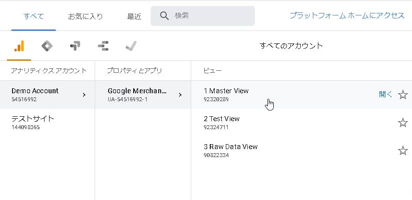 デモアカウントは「1 Master View」「2 Test View」「3 Law Data View」の3つのビューから選択できます。