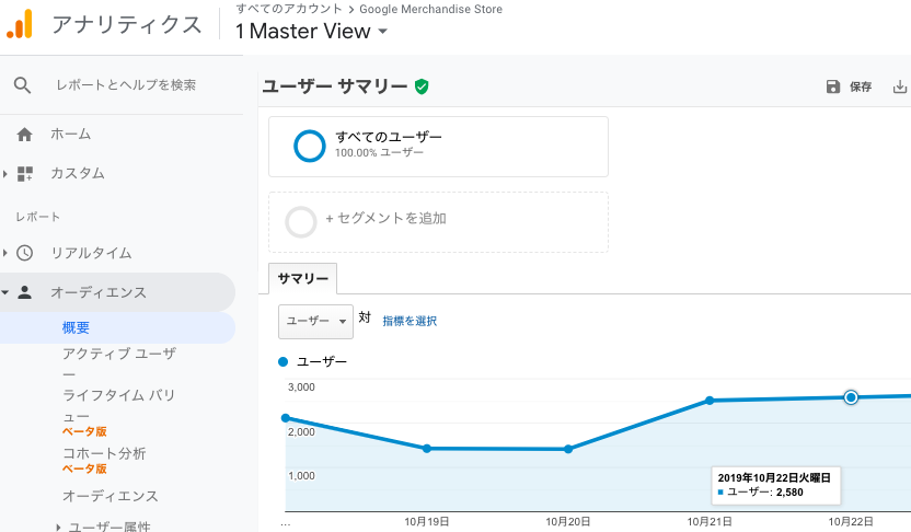 Google アナリティクスのデモアカウントに含まれるデータは、Google ブランドの商品を販売する e コマースサイトである Google Merchandise Store から取得されています。