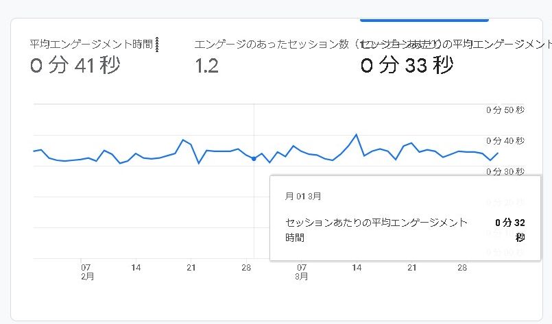 結局「平均エンゲージメント時間」と「セッションあたりの平均エンゲージメント時間」の違いは?と聞かれると回答に迷いそうな気がしますが・・・「セッションあたりの」は、その名の通りセッションあたりでエンゲージメントしている時間の平均となりそうです。