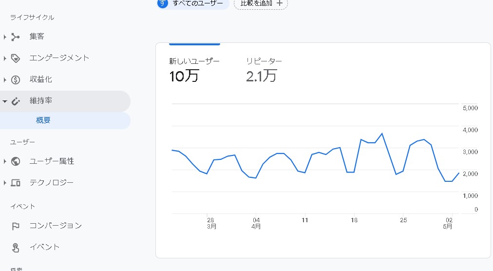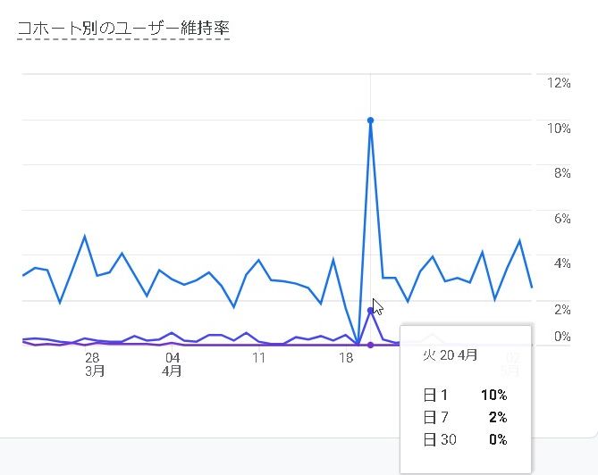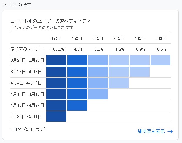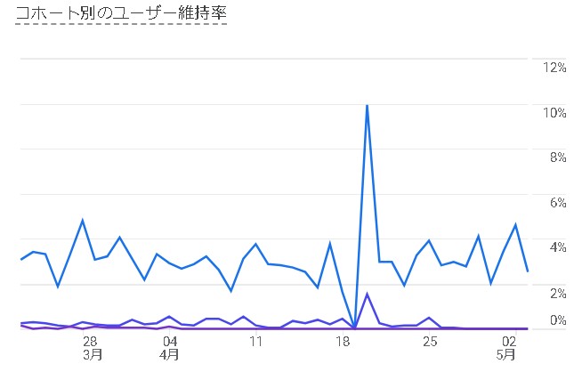 GA4では「コホート別のユーザー維持率」というグラフが表示されるようになりました。