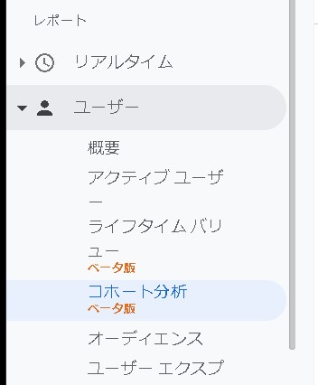 GA3の時には、ユーザー>「コホート分析」というレポートの中にコホート分析がありました。