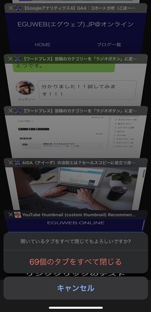 アプリでブロックする前のタブが開いているとカウントされたままになる可能性があるので、一度「タブをすべて閉じる」からすべてのタブを閉じておきます。