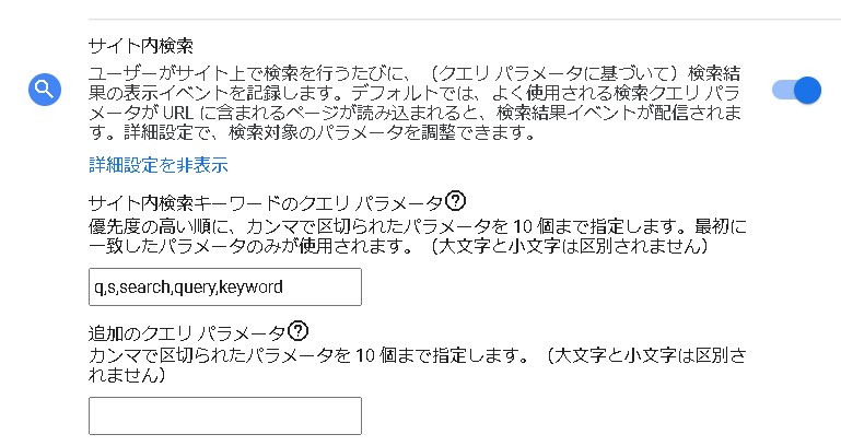 サイト内検索キーワードのクエリパラメータの設定は拡張計測機能内に