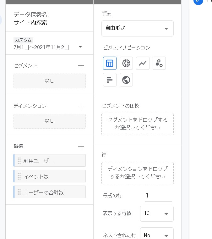 以前のUA(ユニバーサルアナリティクス)の時のようなレポート画面が見当たらないので、データ探索機能を使って、サイト内検索を取得してみます。
