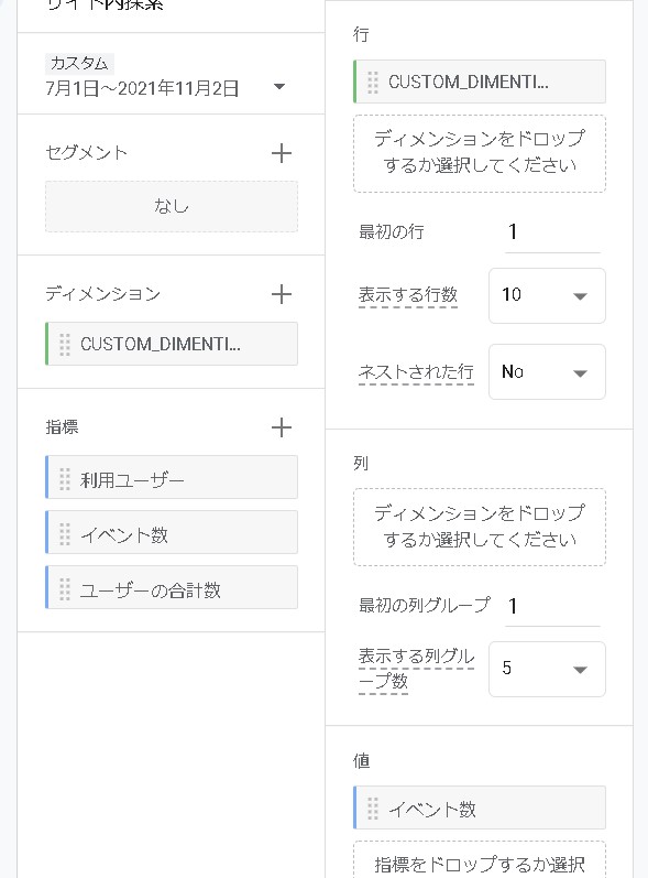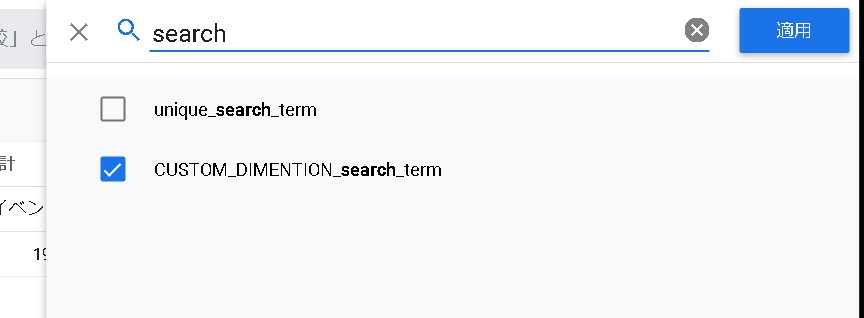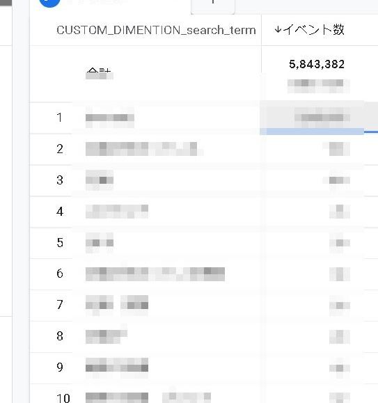 行にカスタムディメンションの「search_term」、値に「イベント数」を設定します。そうすると、サイト内で検索したキーワードが取得できます。