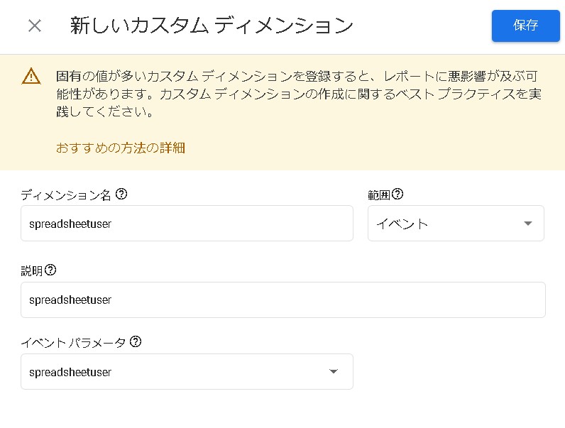 あとは、レポート画面で見れるように「カスタムディメンション」を作成しておきます。