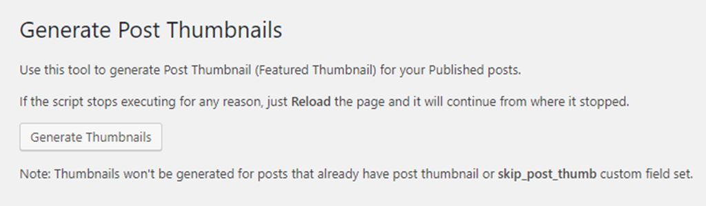 Note: Thumbnails won’t be generated for posts that already have post thumbnail or skip_post_thumb custom field set.