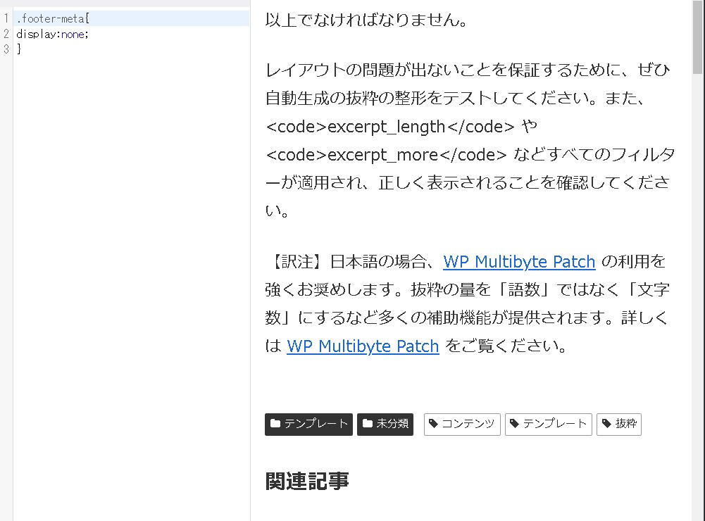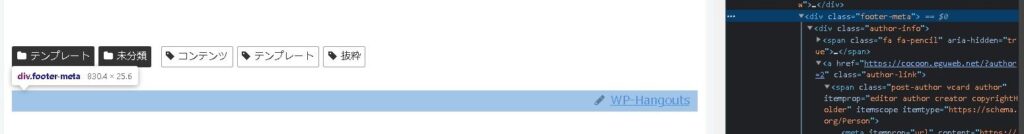 article-footer entry-footerを使うとカテゴリやタグのアイコンまでが消えてしまうので、ここは「footer-meta」の部分を使います。