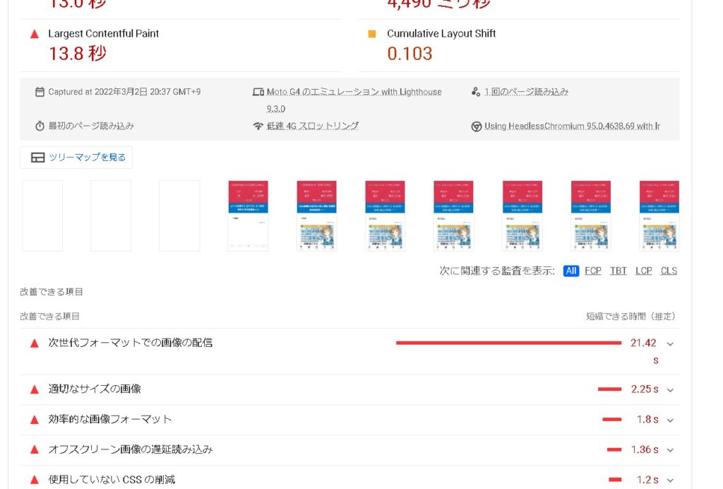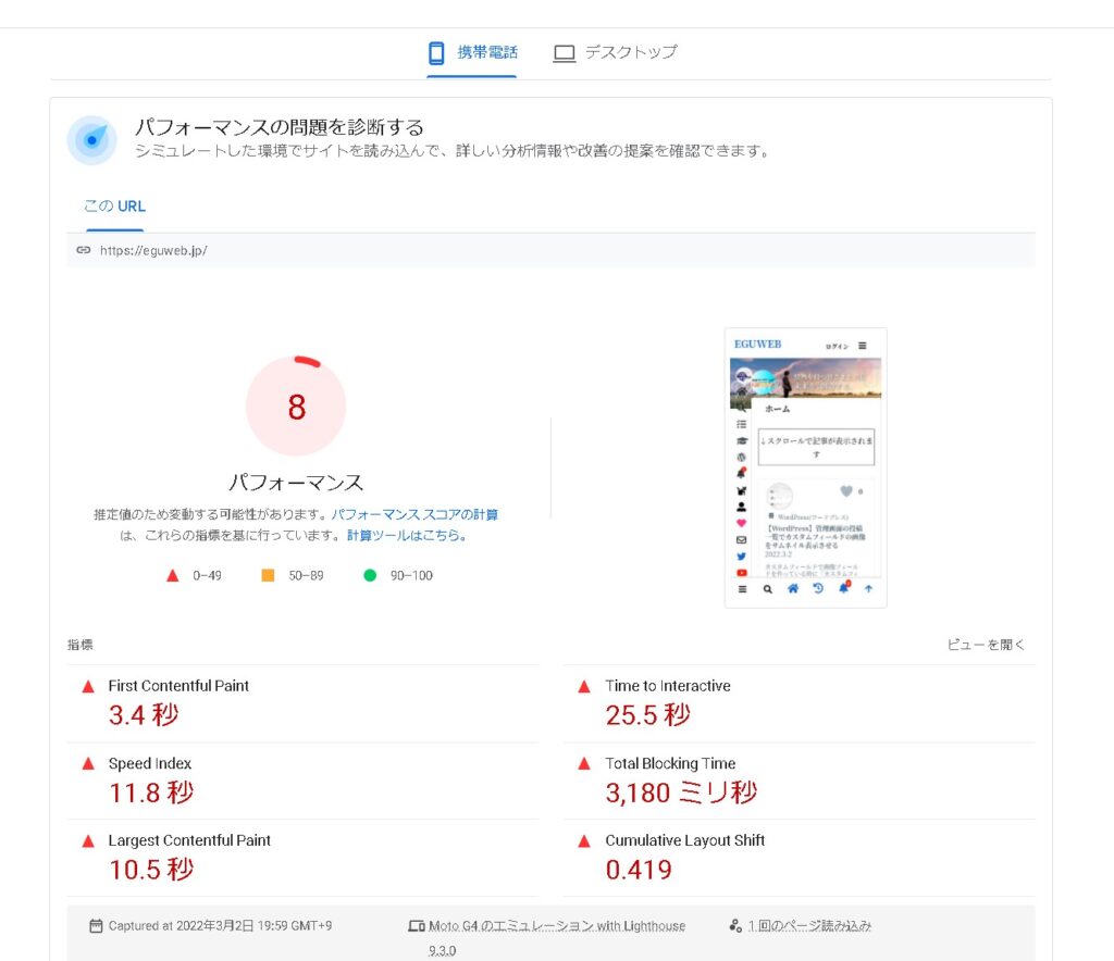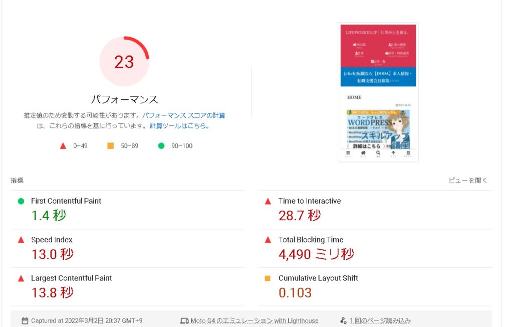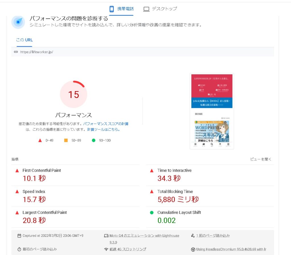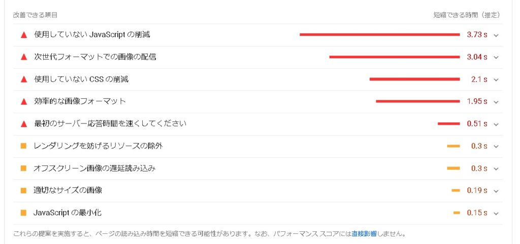 「レンダリングを妨げるリソースの除外」がたしかに消えました!ただ、画像の表示でスコアが低いようです…このあたりは別の方法で調整してみたいと思います。