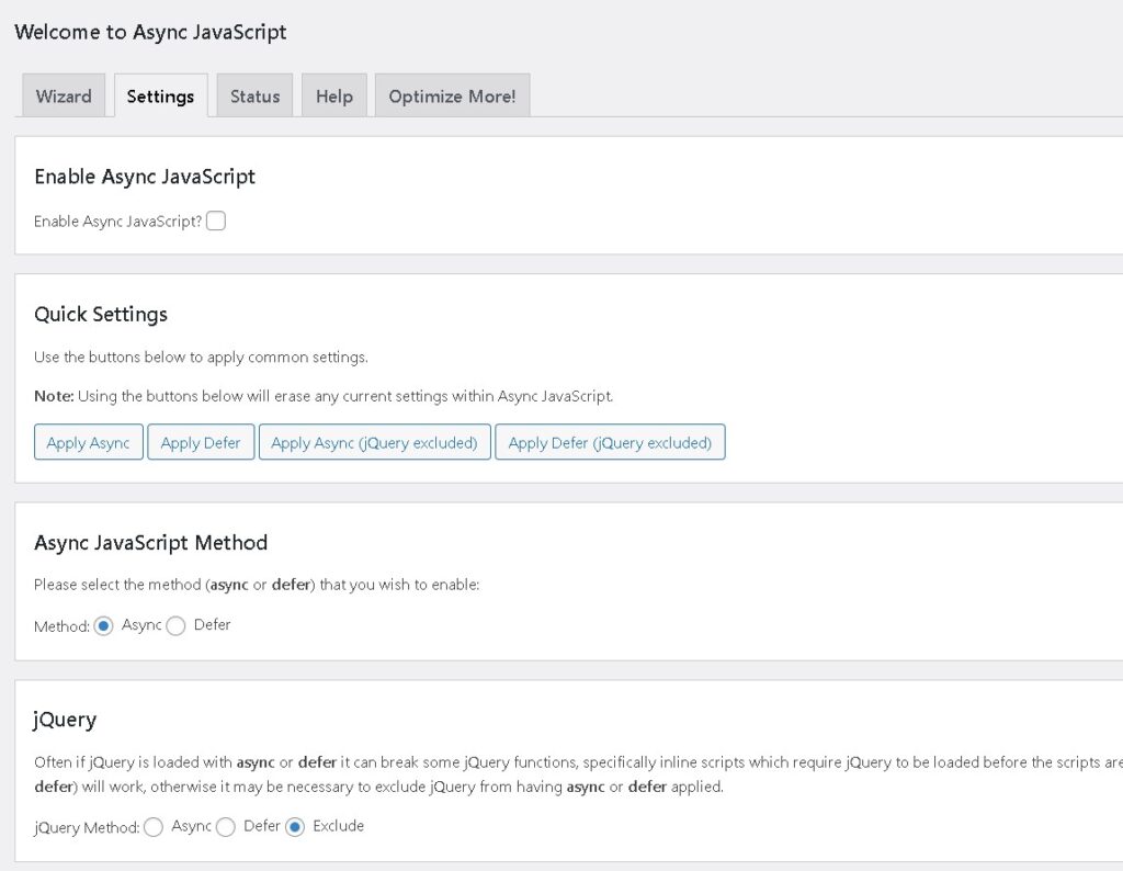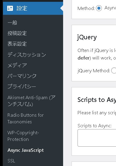 プラグインを有効化すると、設定画面の中に「Async JavaScript」というメニューが追加されます。
