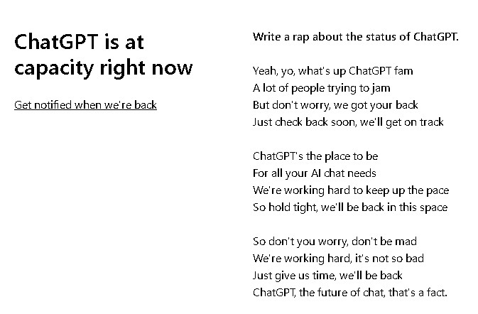 なんと、現時点で「ChatGPT is at capacity right now」となっていました…。どうやら定員を超えたようです。