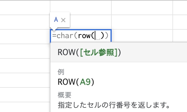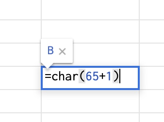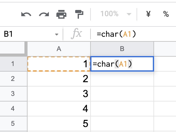 使い方は簡単で、=char(数値)を入れると、数値に対応した文字が返り値として表示されます。
