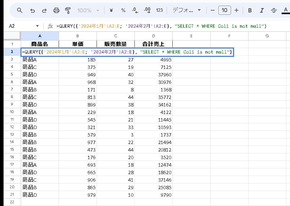 QUERY関数を使用する: QUERY関数はデータベースのような機能を提供し、複数のシートからのデータを結合してクエリすることができます。