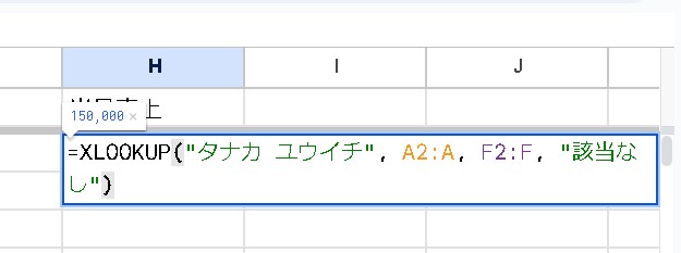 この式は、A2:A の範囲(社員名)内で タナカ ユウイチ を検索し、一致する行の F2:F 範囲(当月売上)から当月売上を返します。もし タナカ ユウイチ が見つからない場合、「該当なし」と表示されます。
