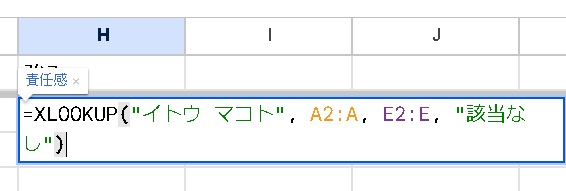 =XLOOKUP("イトウ マコト", A2:A, E2:E, "該当なし")