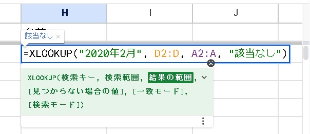 =XLOOKUP("2020年2月", D2:D, A2:A, "該当なし")