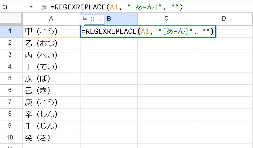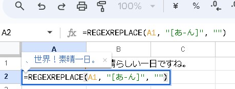 このテキストから、ひらがなのみを削除したい場合、REGEXREPLACE(A1, "[あ-ん]", "") と指定します。この関数は、セルA1内のひらがな(あからんまでの全ての文字)を検索し、それらを空文字に置換(削除)します。