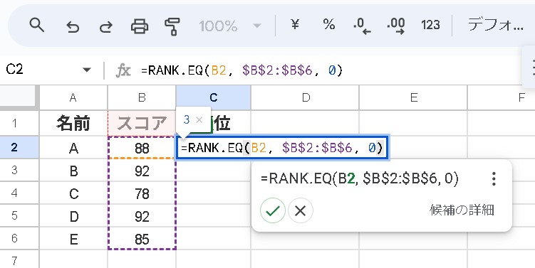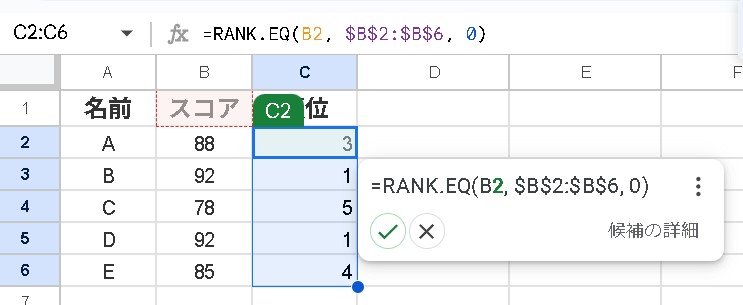スコアがこのリストの中で何位かを知りたい場合、以下のように RANK.EQ 関数を使います。