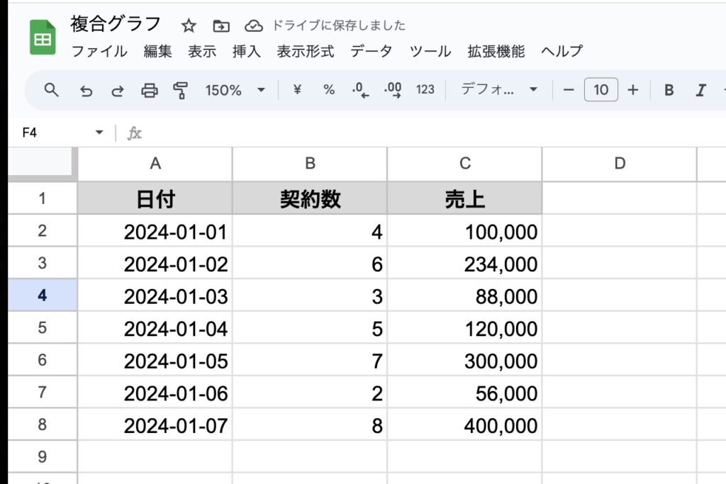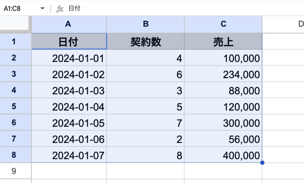 | A列 (日付) | B列 (契約数) | C列 (売上) |