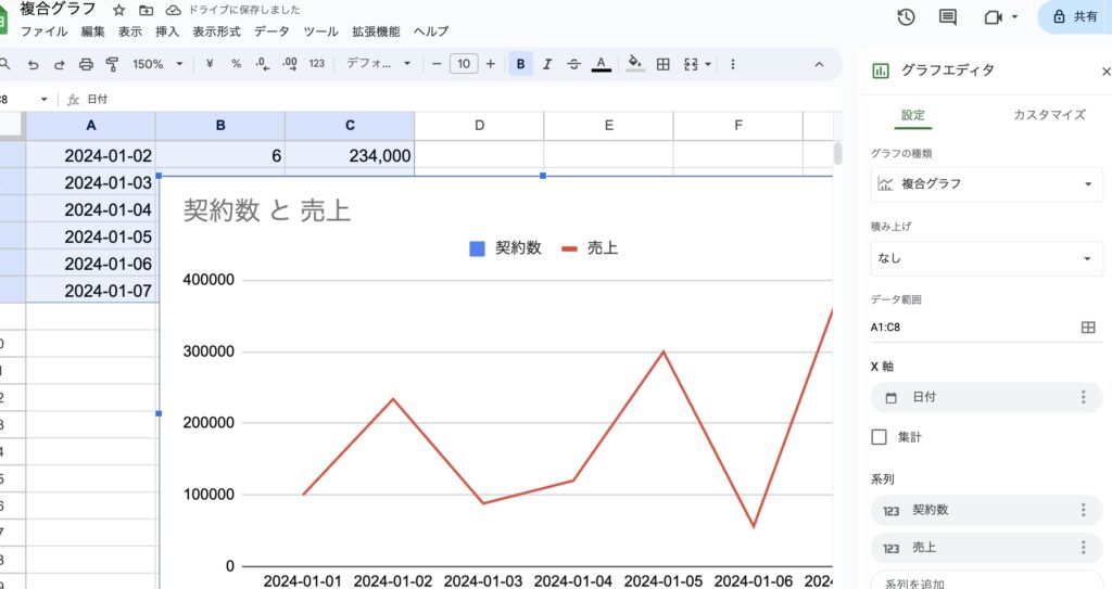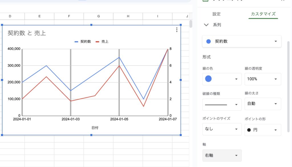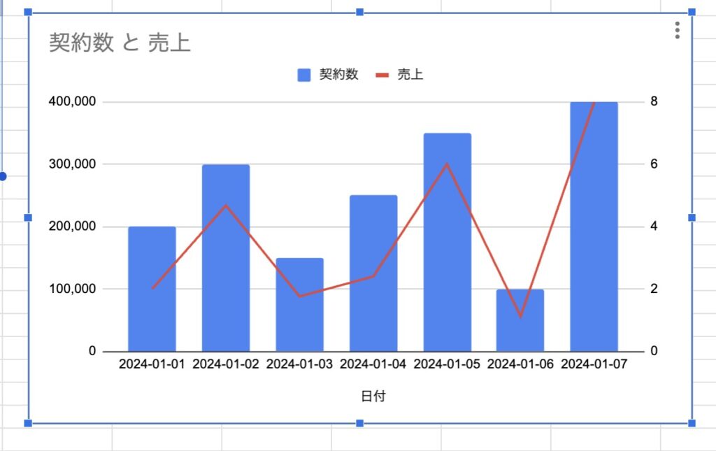 これで、日別の契約数と売上の二軸グラフを作成できます。もしさらに詳細な部分や特定の質問があれば、お尋ねください。
