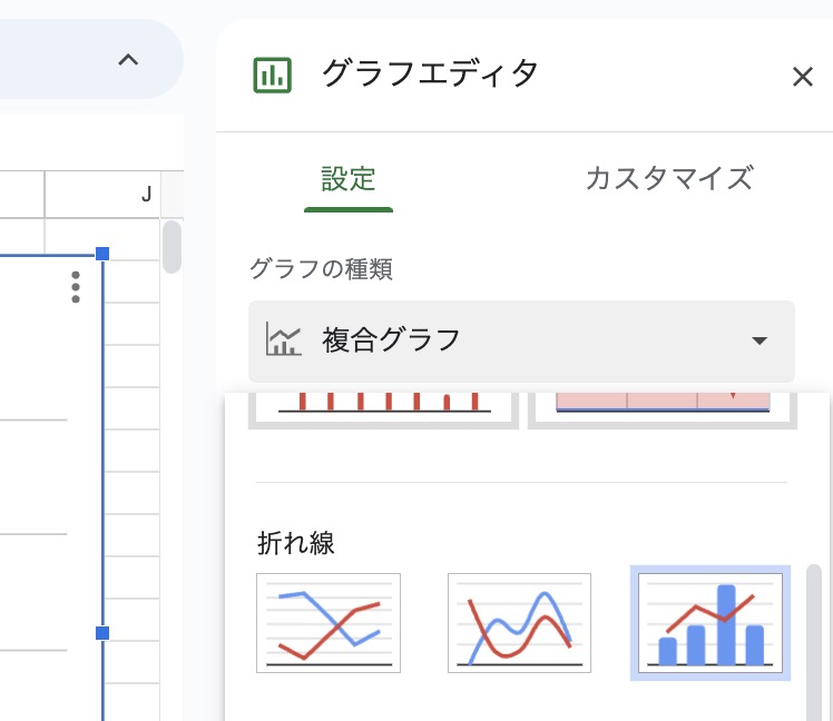 「セットアップ」タブで、「グラフタイプ」をクリックし、「複合グラフ」を選択します。※既に選択された状態になっている場合もあります。