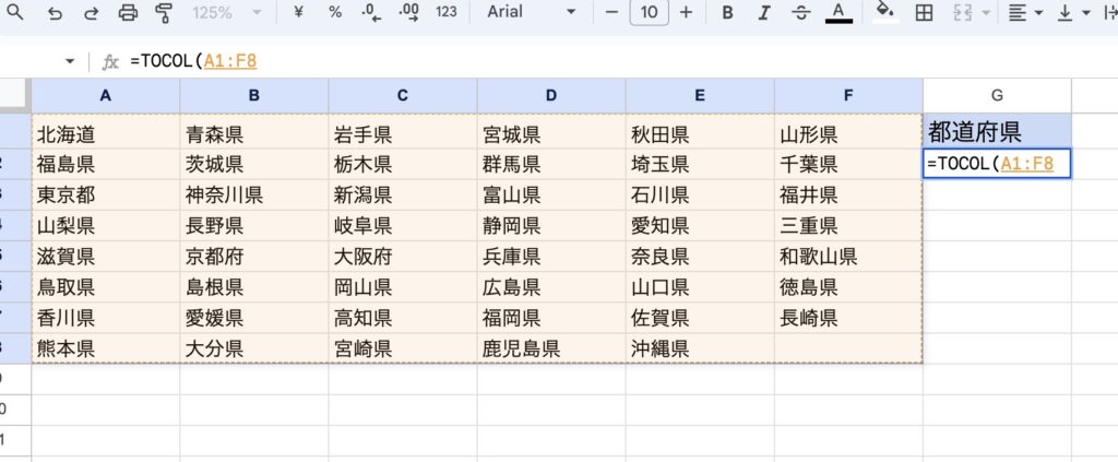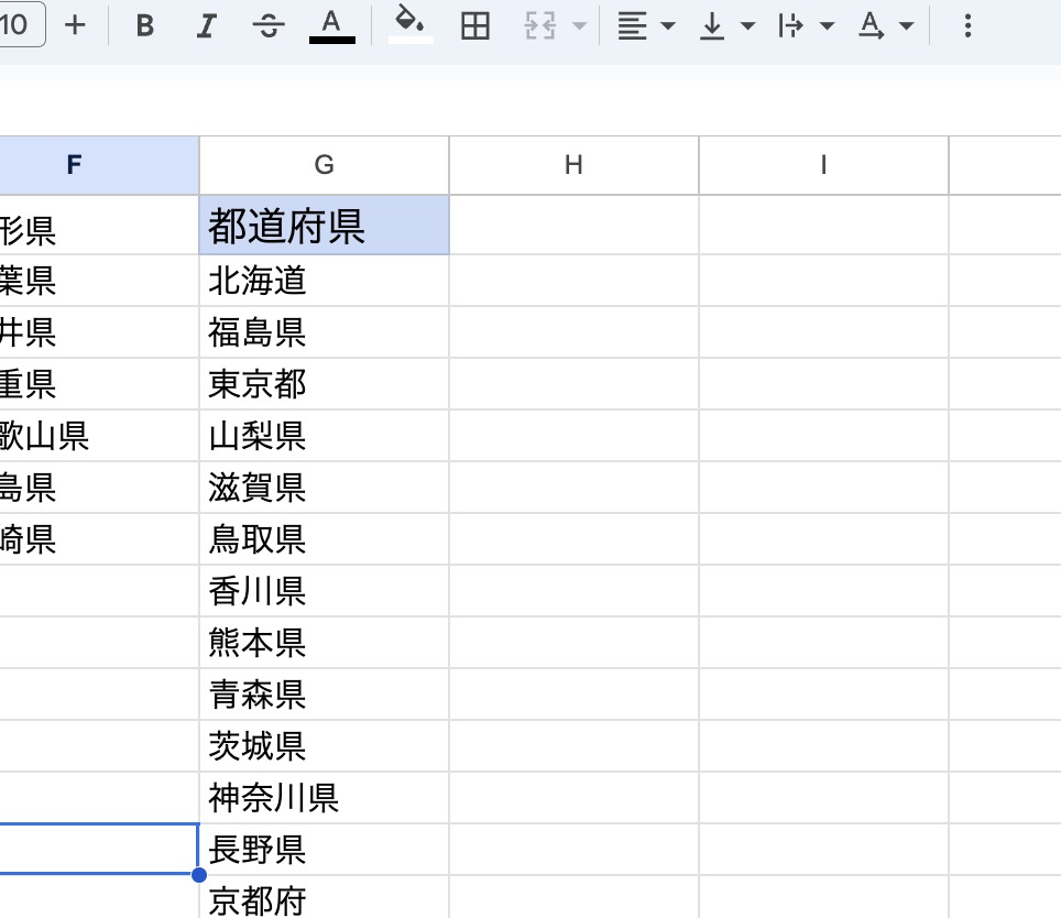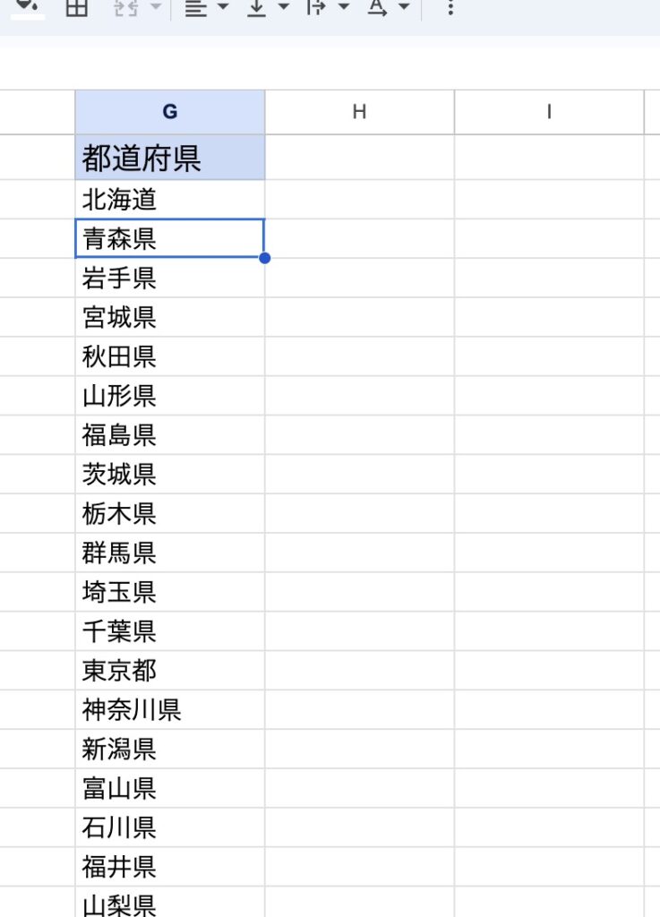 - スプレッドシートを開き、都道府県リストを上記のように入力します。