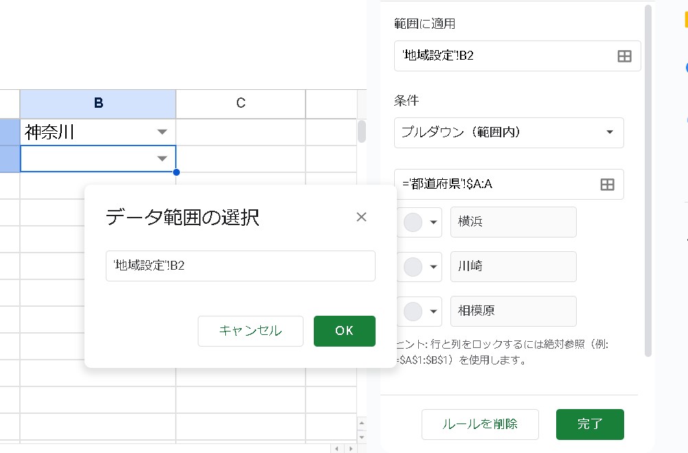 市区町村(地域)の方は、都道府県シートのA列をプルダウン範囲内に指定します。