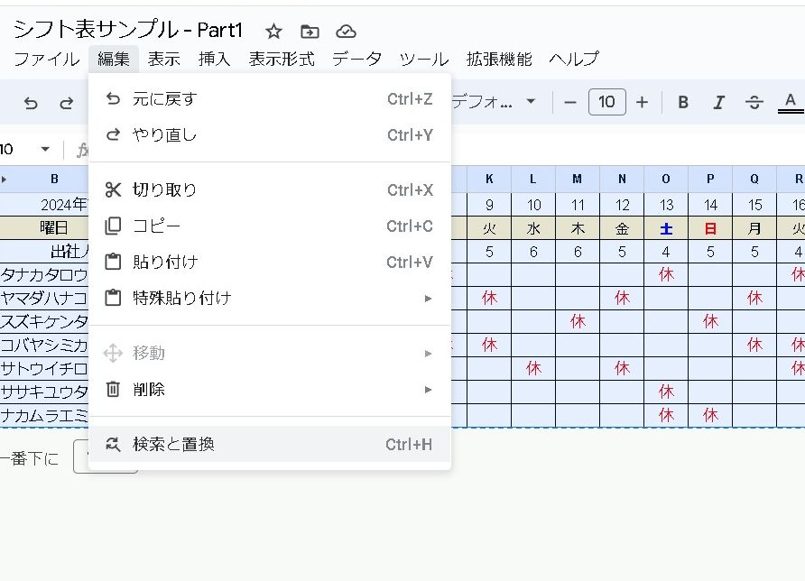 この手順により、選択した範囲内の空白セルがすべて「出」に置き換えられます。ただし、空白セルの一括置換がうまくいかない場合もあるため、その際はGASなど他の方法も検討してください。