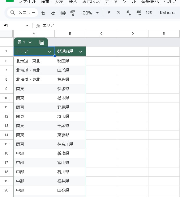 このように、「エリア」と「都道府県」のペアをすべてリスト化しておくことで、連動が可能になります。