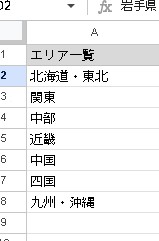 まず、A列にエリア一覧を表示します。