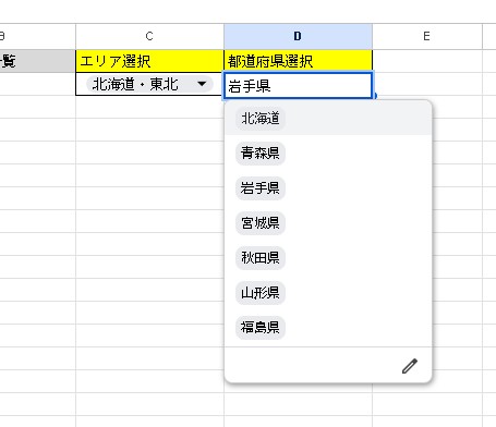 これで、C2で選んだエリアに応じて、D2に表示される都道府県が動的に切り替わるようになります。