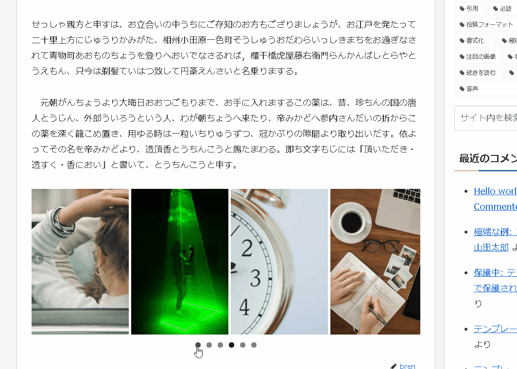 cocoonテーマなどには、最初からかっこいい感じのカルーセル設定があって、このまま使うのもありな感じです。