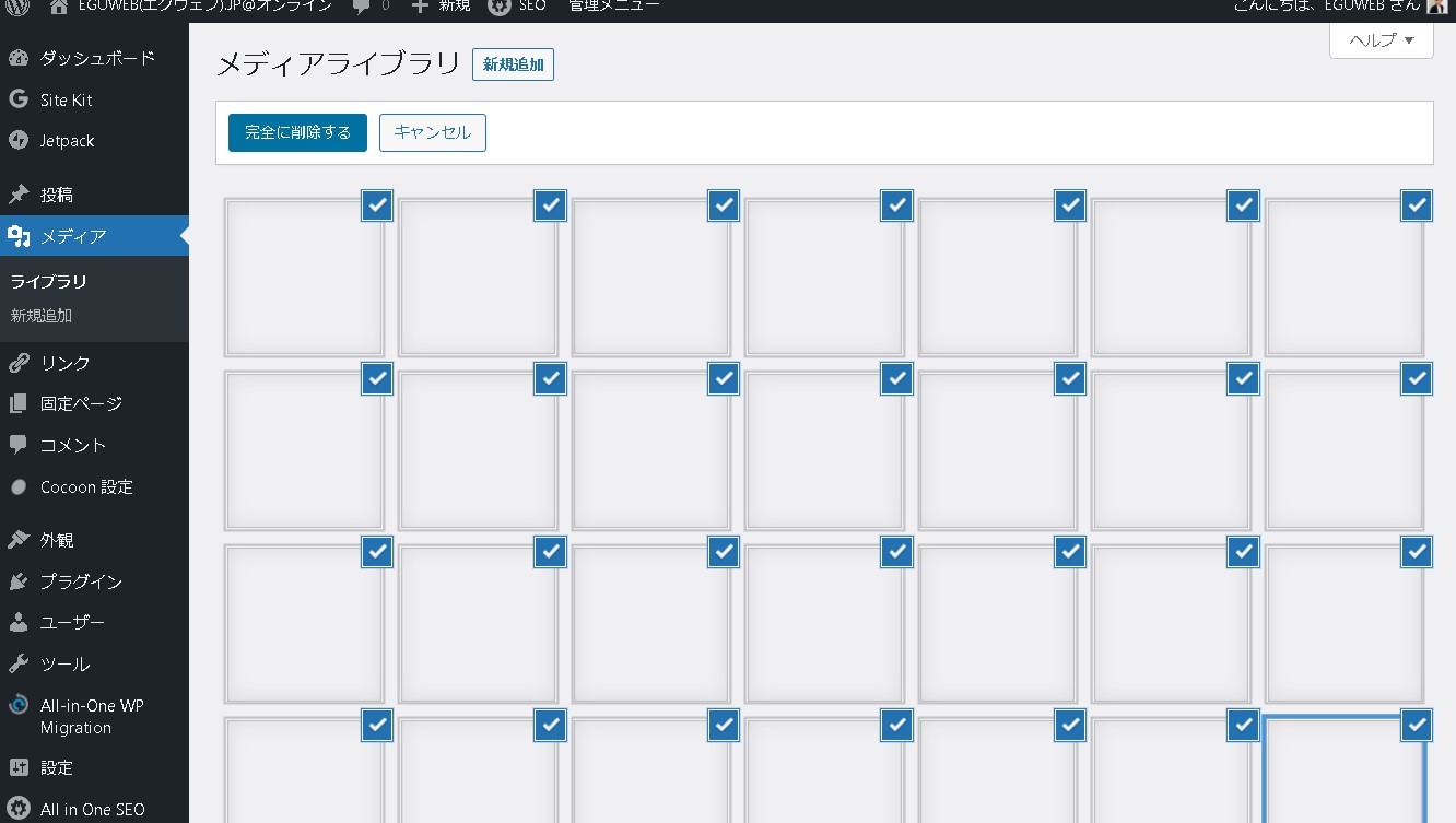 このメディアライブラリの中で使用していない画像を一気に削除する方法です。