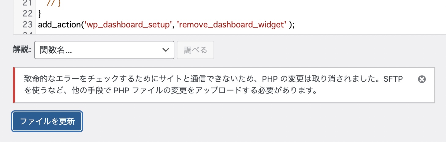 致命的なエラーをチェックするためにサイトと通信できないため、PHP の変更は取り消されました。SFTP を使うなど、他の手段で PHP ファイルの変更をアップロードする必要があります。