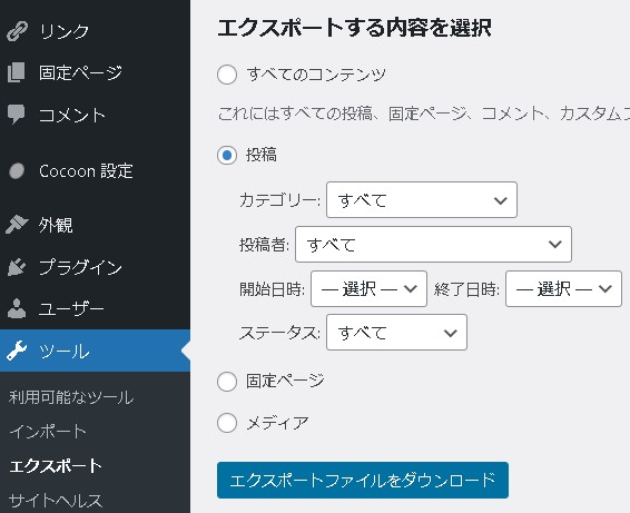 「すべてのコンテンツ」の場合は3つのすべてをまとめたファイル、「投稿」は投稿のデータ、「固定ページ」は固定ページのデータ、「メディア」はメディアの情報(画像データそのものではない点にご注意下さい)がダウンロードできます。