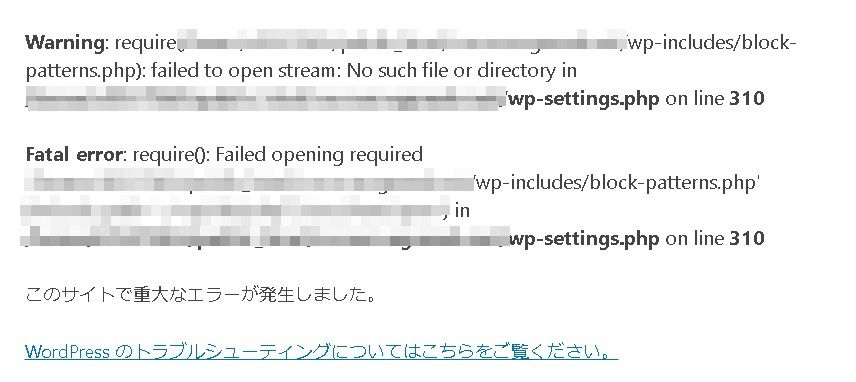 もし「ワードプレス本体の更新」の最中でエラーが発生したとなれば、本体のファイルの欠損の可能性があります。
