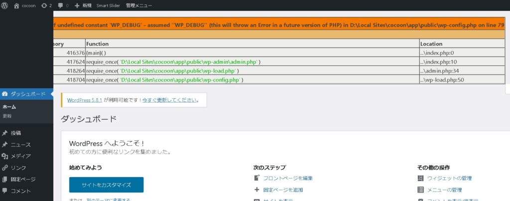 そうすると、ワードプレスがデバッグモードという状態になり、問題がある(インクルードで見つからないファイル名など)が表示されるようになりますので特定しやすくなります。
