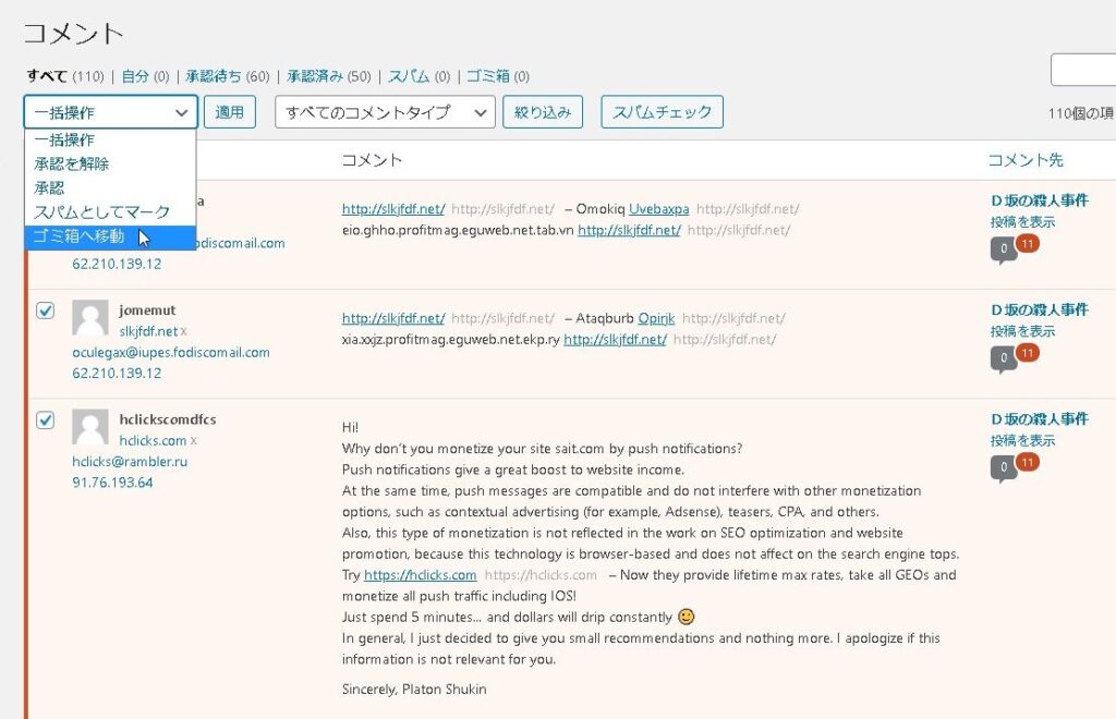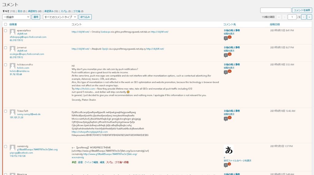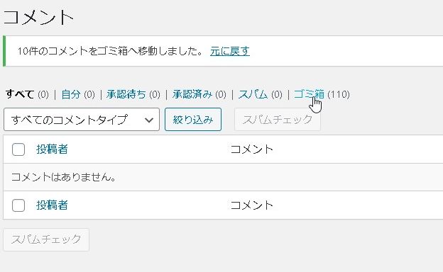 これで、スパムコメントは、ほとんど届かなくなります。注意点は、すでにコメントとして入ってしまっている(承認待ち・承認済みの)コメントは自動的に消えないので、手動で削除してあげる必要があります。