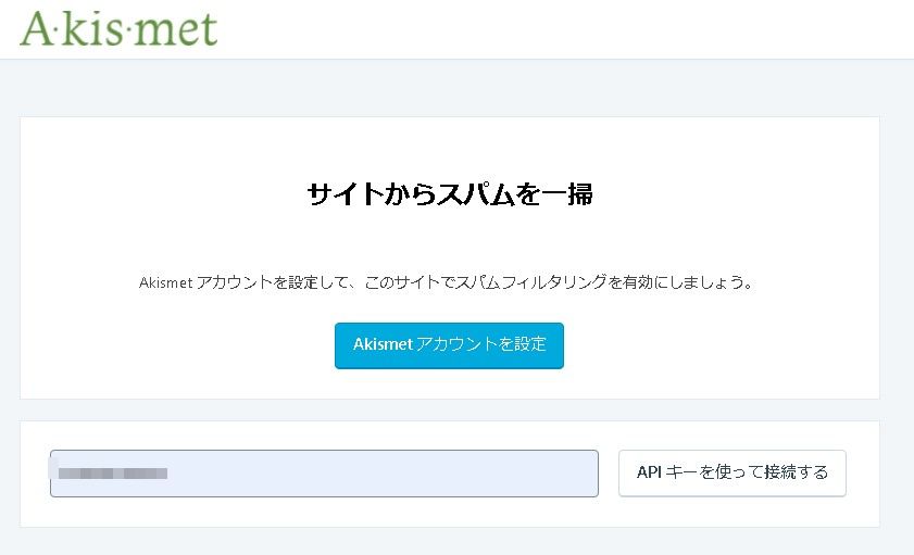 APIキーを設定する場合は事前に発行してもらったAPIキーをコピーして「APIキーを使って接続する」を押すことで Akismet プラグインが有効化されます。