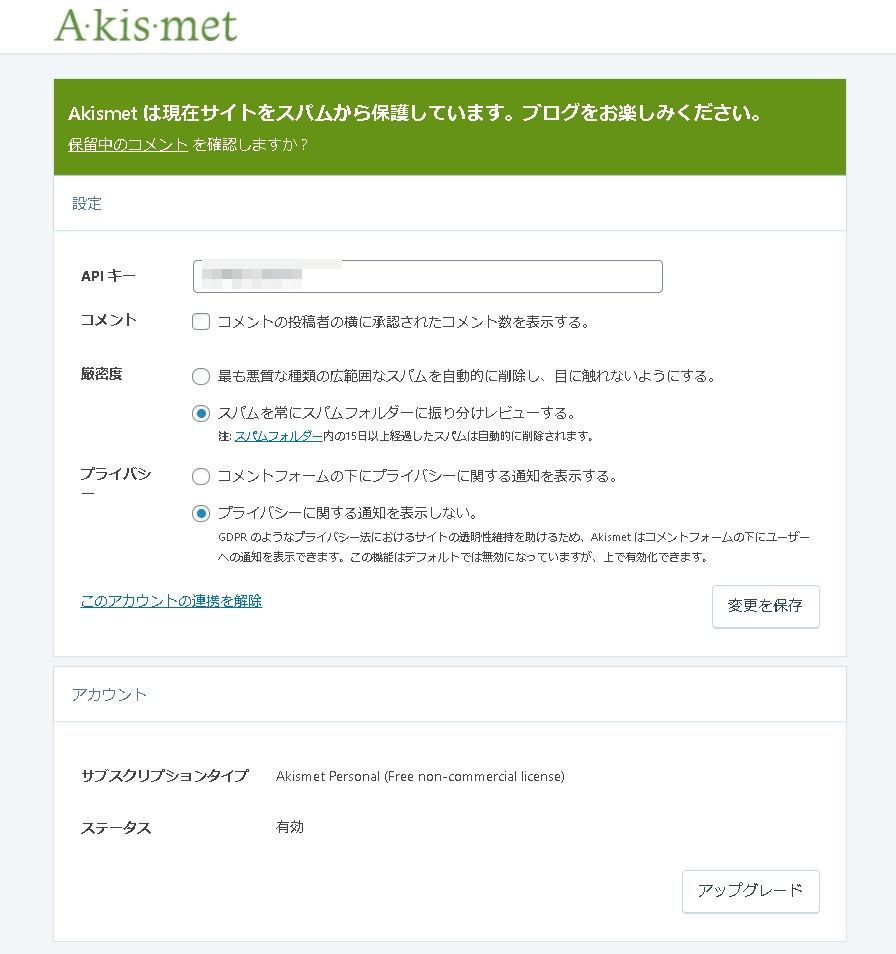 この Akismetですが、基本的には無料で使えます。有料プランにすると、優先的にサポートを受けることができるようになったり、高度な統計情報を見ることができるようになります。必要があれば検討してみましょう。