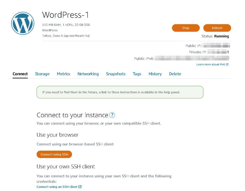 Connectのタブを開くと、接続情報が表示されます。ここからインスタンスに接続が可能です。