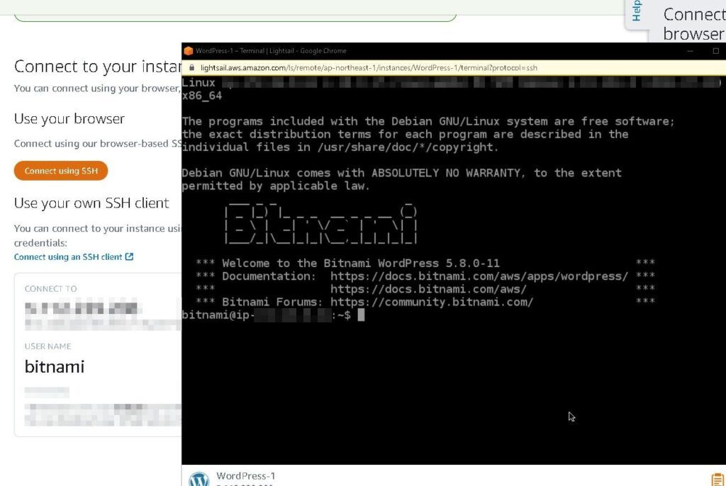 「Connect using our browser-based SSH client」Connect using SSHでインスタンス、Bitnamiに接続してみます。