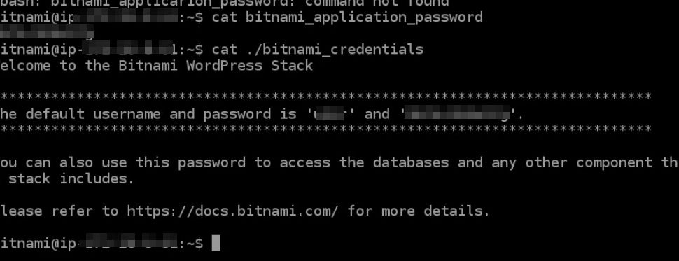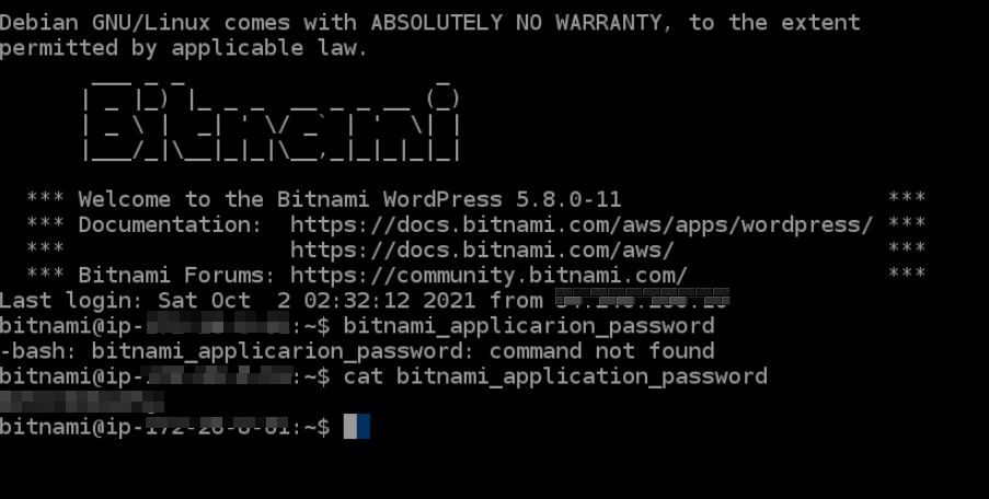コンソール画面で「cat bitnami_application_password」と入力して送信すると、ワードプレスにログインする際のパスワードを教えてくれます。