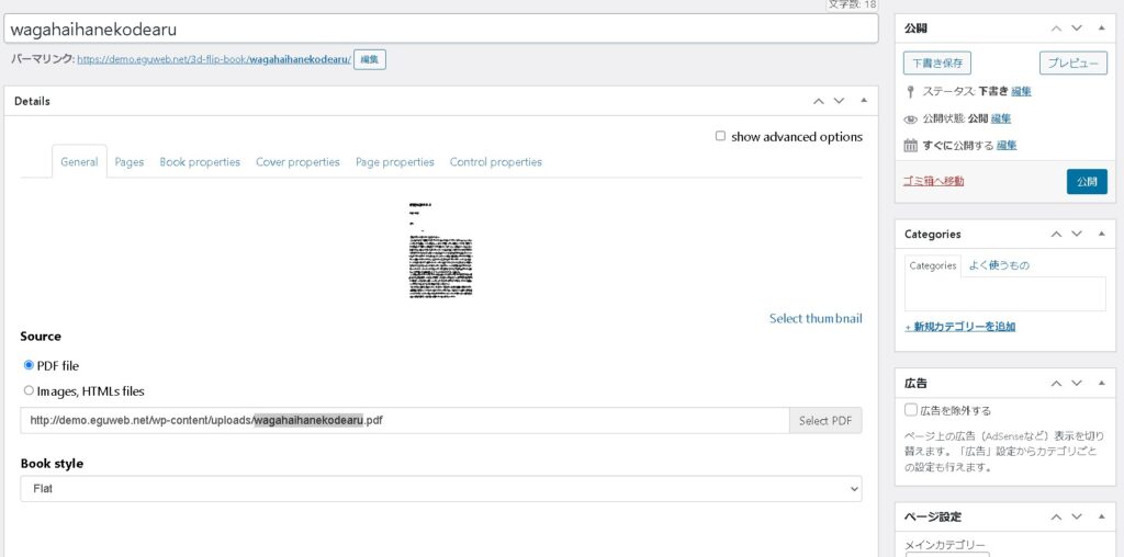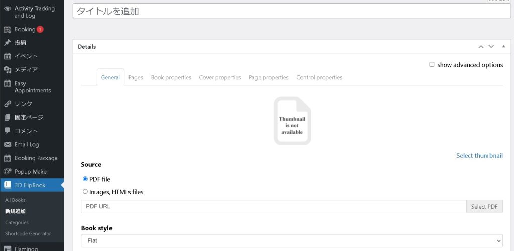 プラグインを有効化すると3D FlipBookというメニューが新しく追加されているので、選択して画面を開きます。