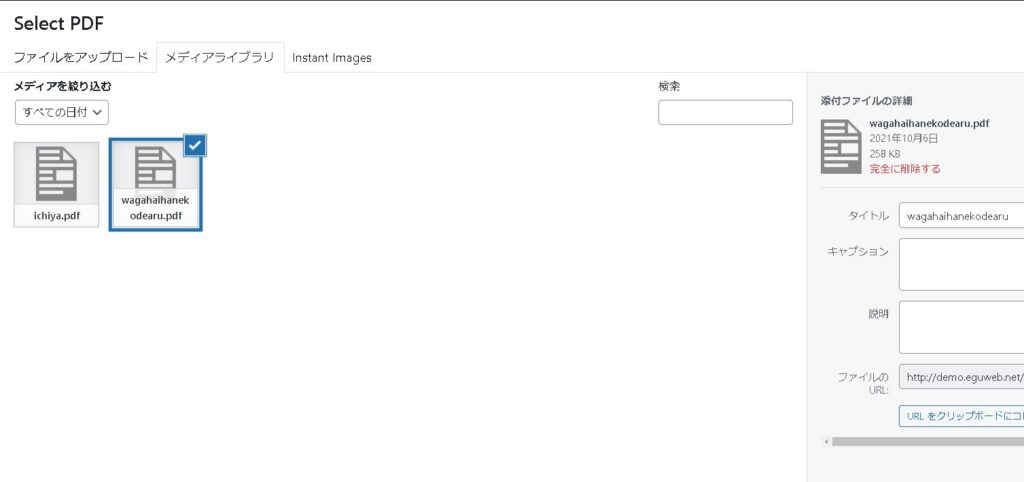 あとは、selectPDFからメディアにアップロードしたPDFファイルを選択します。