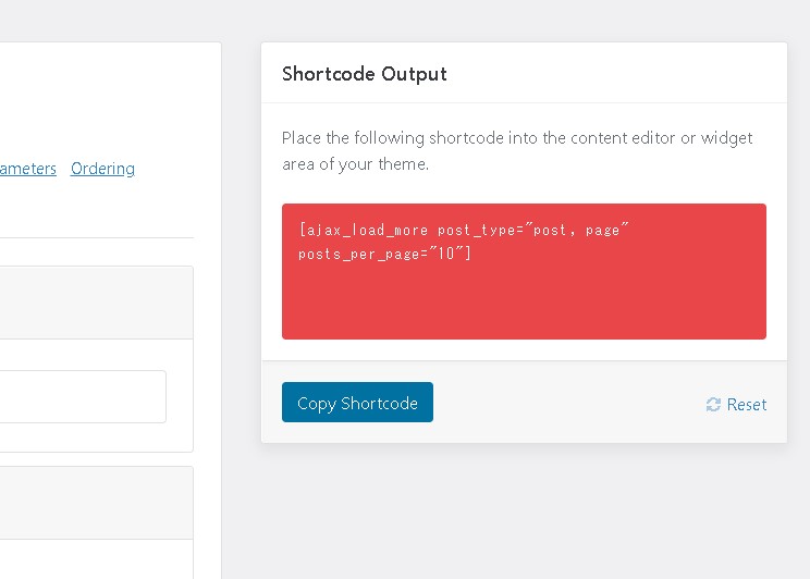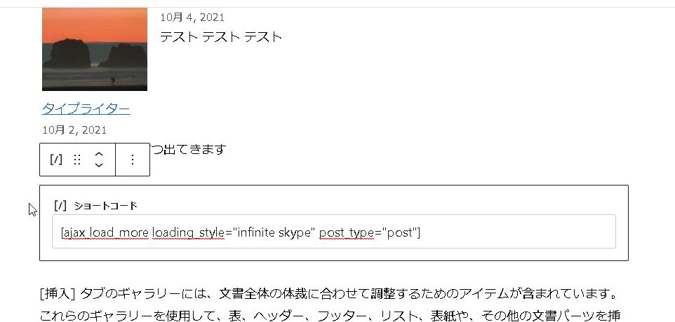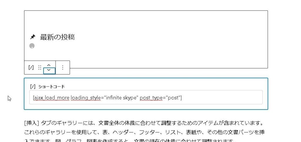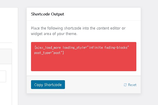 Ajax Load(自動無限スクロール)をしたい場所にショートコードを貼り付けます。※設定を変えると埋め込むショートコードも変わるので注意が必要です。